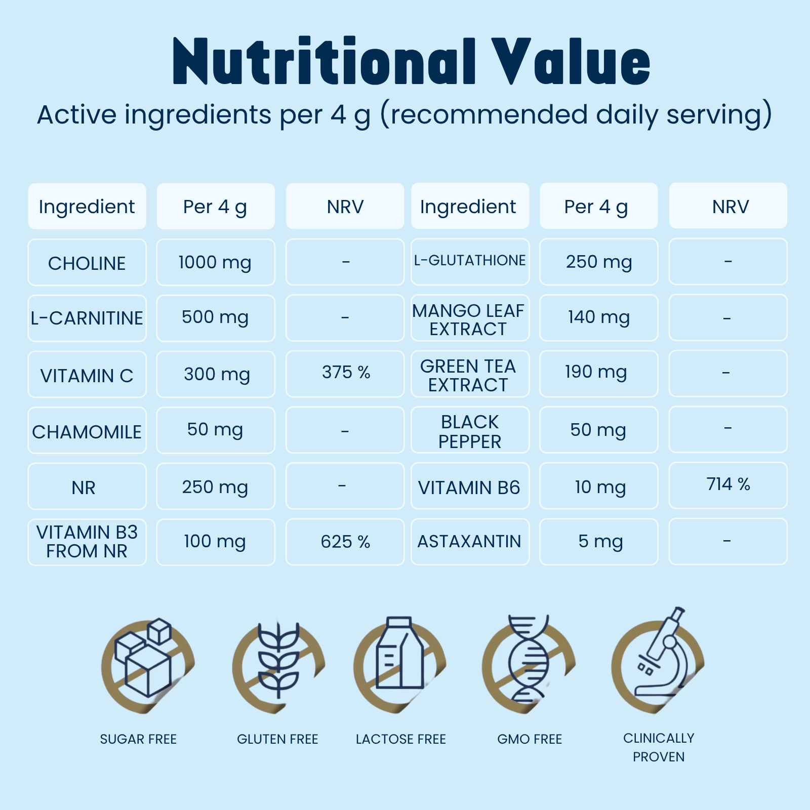| Per daily dose (4 g) | NRV | |